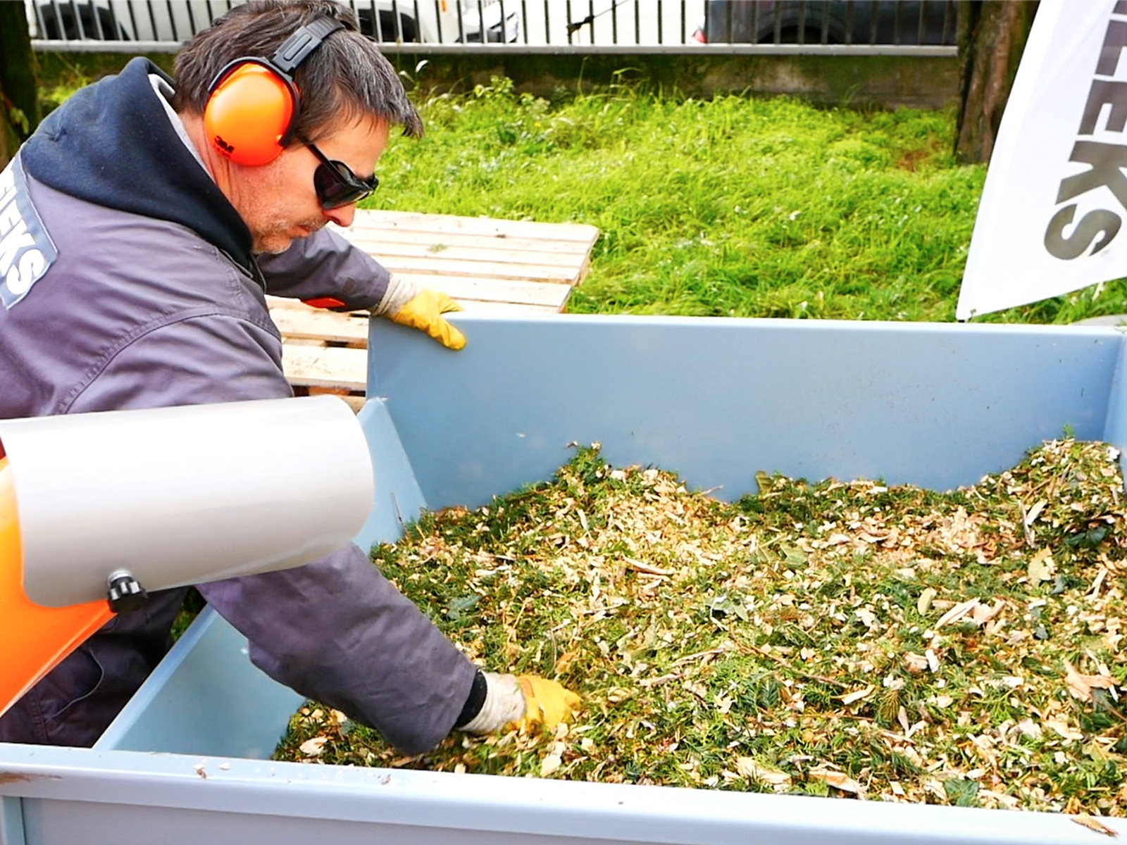 Prepracovaný vyhadzovací komín z hrubšieho priemeru. Jeho výška 160 cm umožňuje vypúšťanie materiálu priamo do nádob na kompost alebo na korbu nákladného vozidla. Za pár sekúnd je možné pomocou dvoch motýlikových pák upraviť smer alebo ho odstrániť.