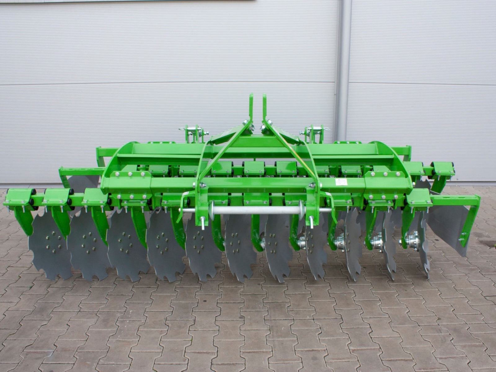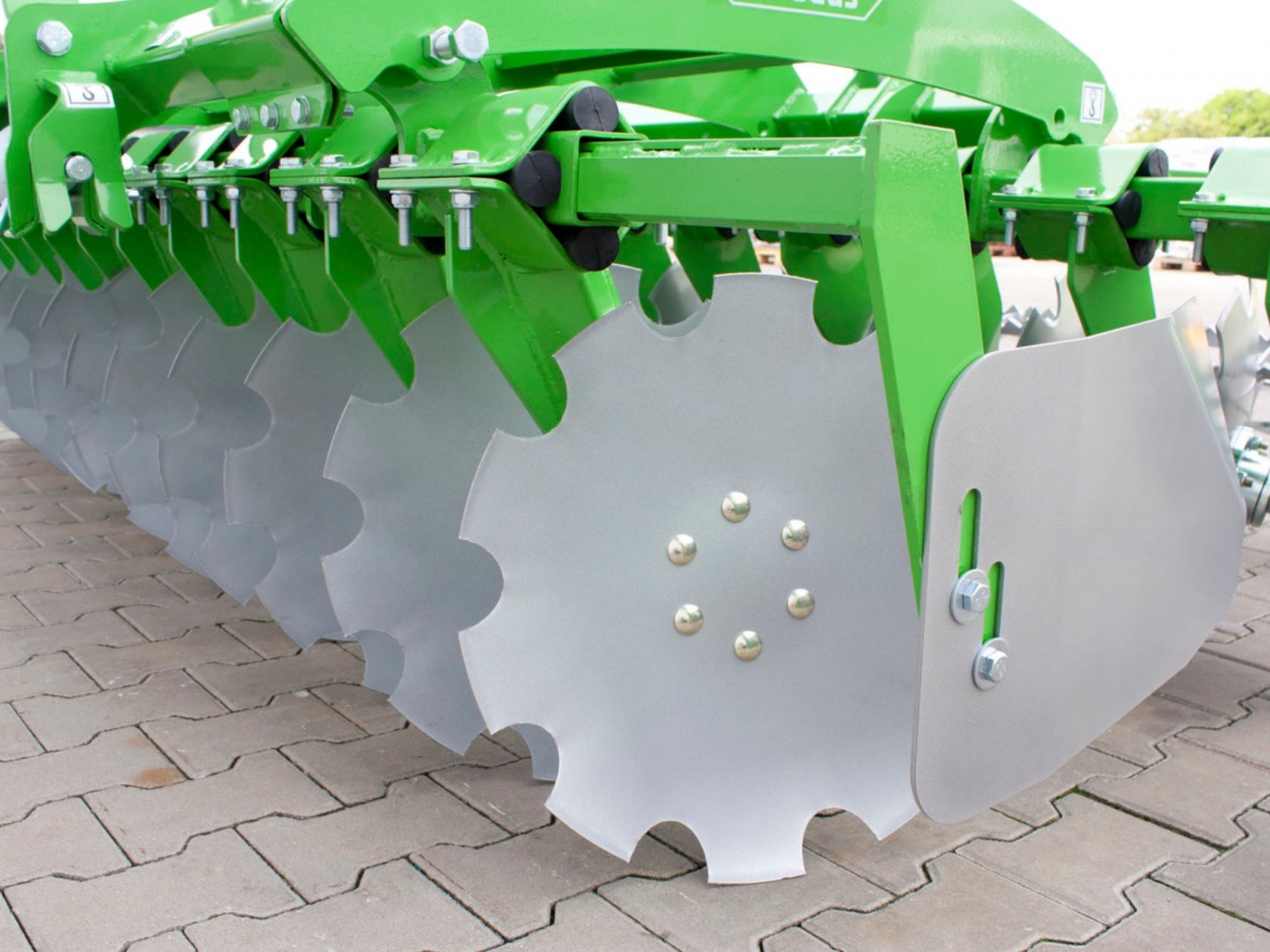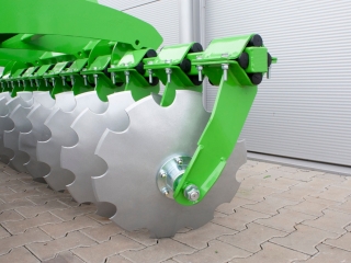 - Hlavným konštrukčným prvkom diskovej brány je nosný rám. K dispozícii sú tiež dva paralelné nosníky vybavené ozubenými diskami s priemerom 510 mm. Sú namontované na ráme s uhlom sklonu 15˚ .