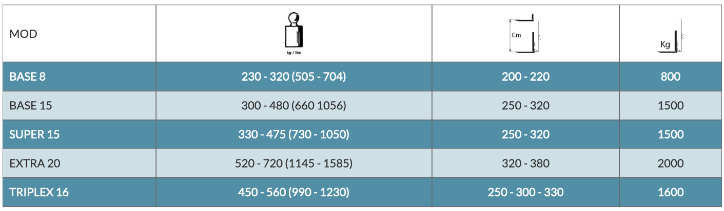 1. Model s ohnutými plechovými profilmi a vložkami, so zaťažením od 800 do 1 500 kg a štandardným hydraulickým rozdeľovačom.