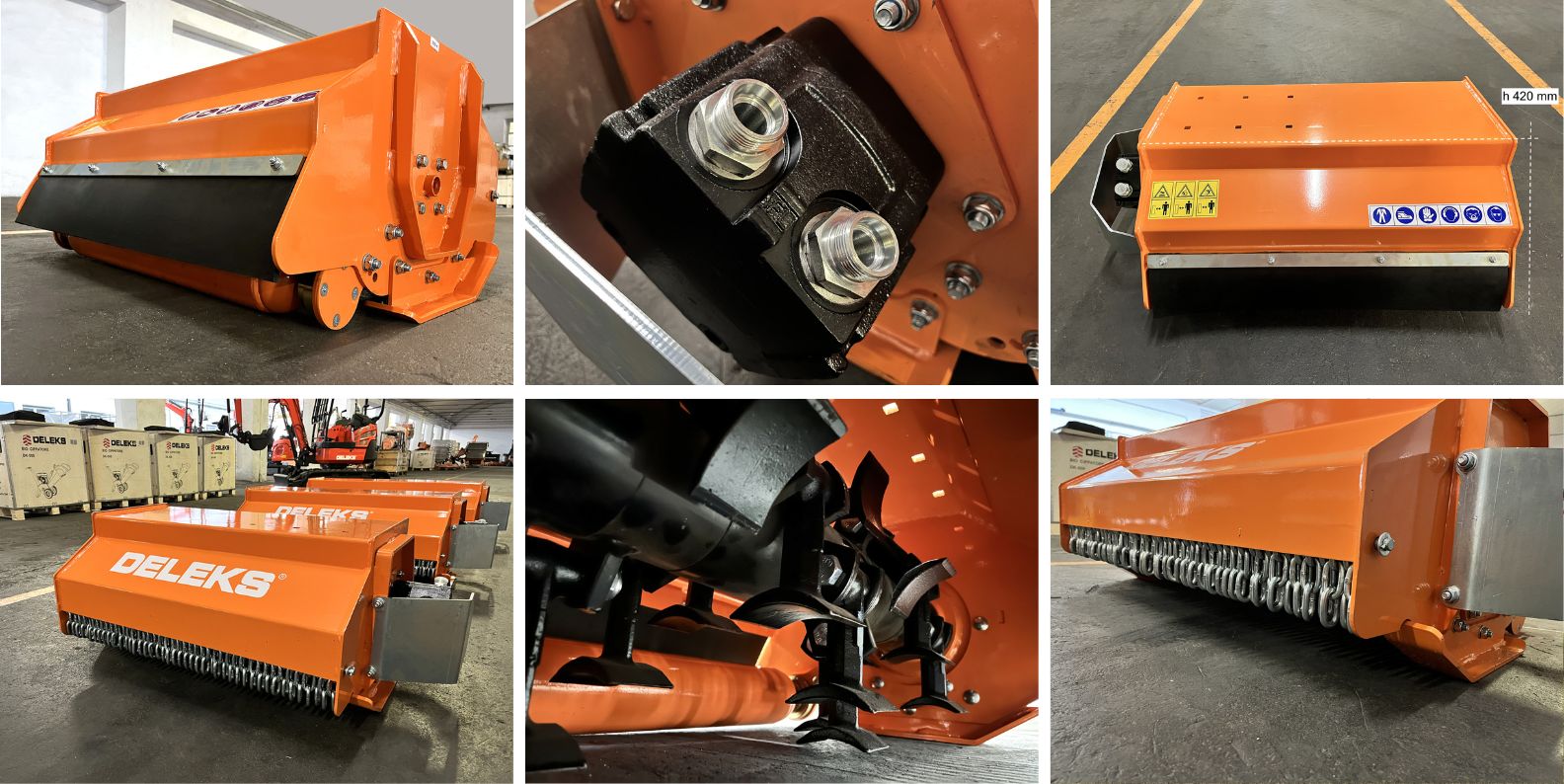 • Mulčovač na bager DELEKS ARM-100 s pracovnou šírkou 100 cm a hmotnosťou 178 kg. Mulčovač s počtom kladiviek 24 vhodný pre 2 - 5 tonový bager.