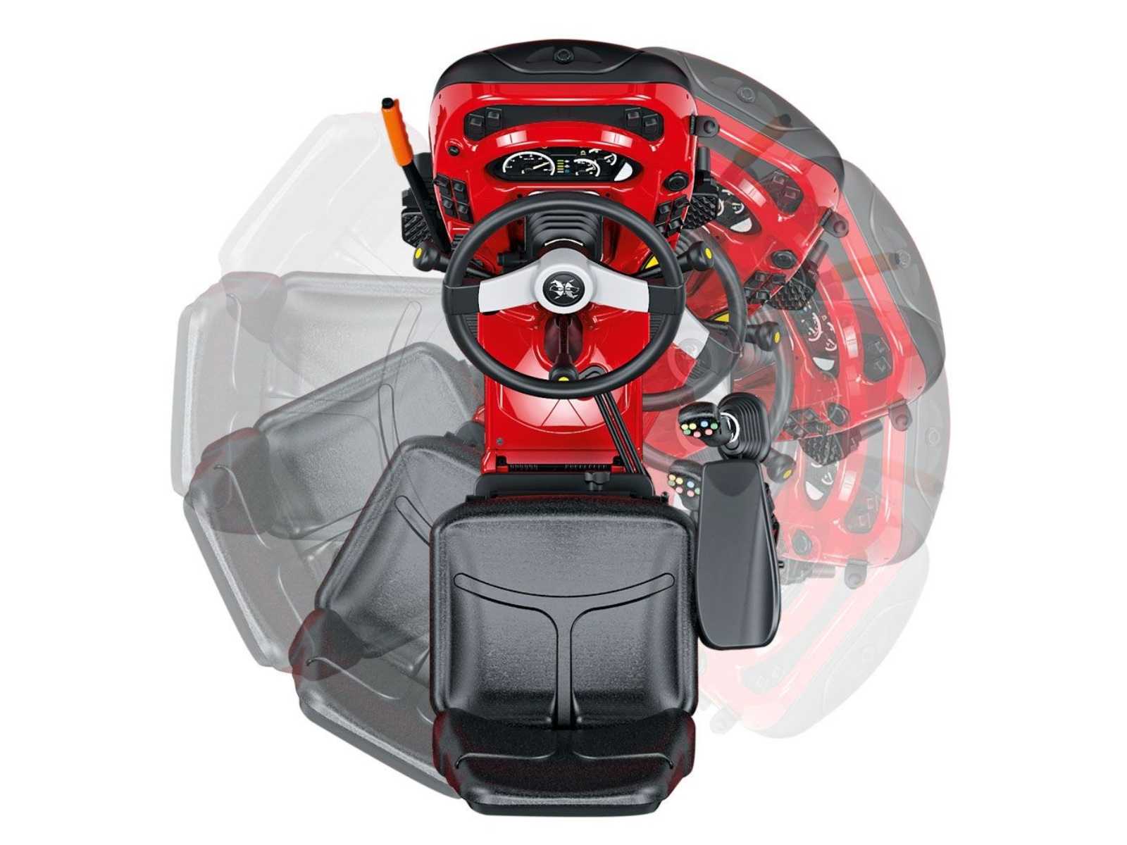 Kabína je odhlučnená a vybavená klimatizáciou. Obsluhe na palube ponúka 360° všestranný výhľad najmä na zariadenie a terén okolo traktora, a to aj pri cúvaní a práci medzi úzkymi radmi.