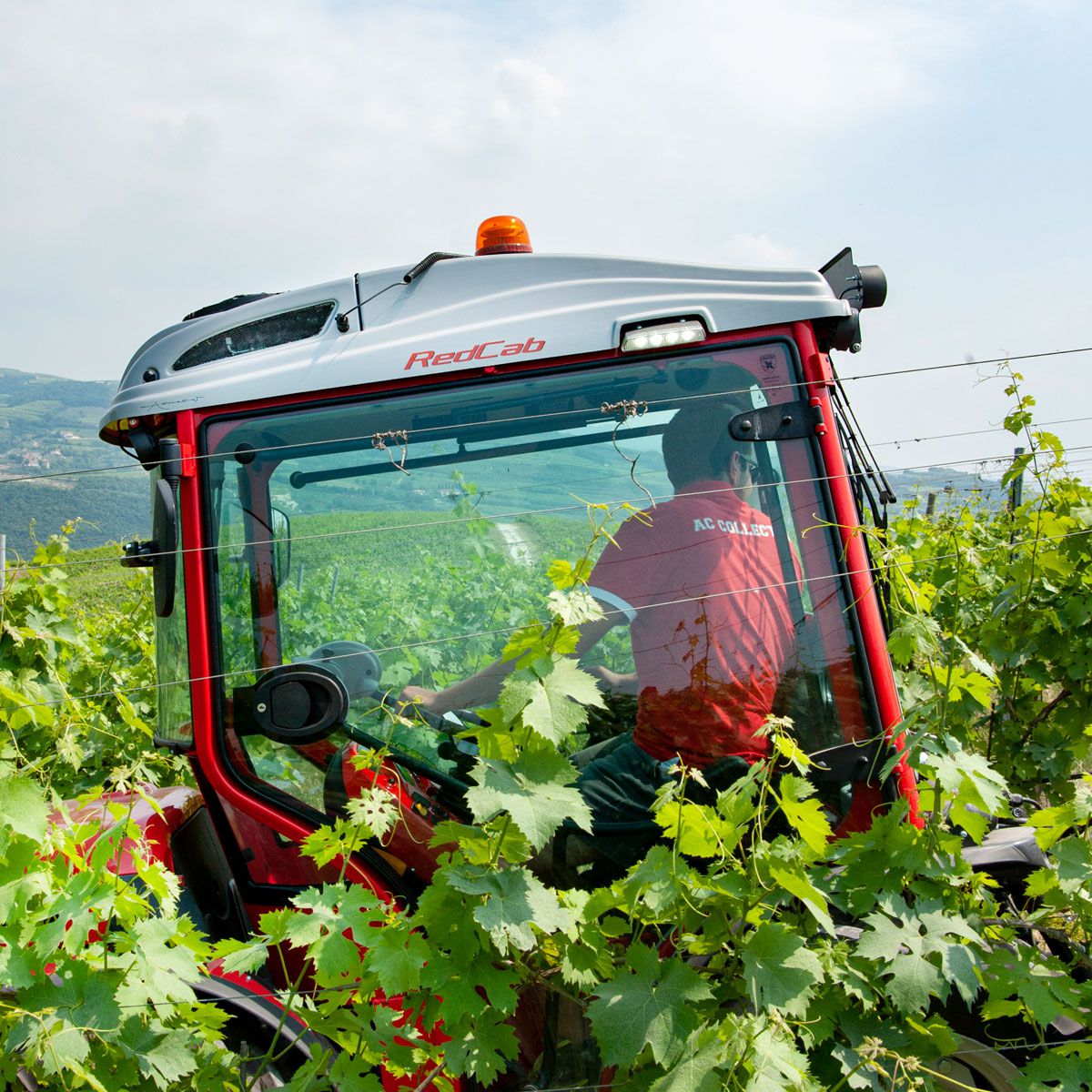 Široké čelné sklo zaručuje operátorovi vynikajúcu viditeľnosť vo všetkých smeroch, privilegovaný výhľad na zariadenie a priestor okolo traktora, čo oceníte predovšetkým pri spätnom chode pri práci medzi veľmi úzkymi plodinami. Pracovné LED svetlomety tiež zaručujú správne osvetlenie v noci a na tmavých miestach.