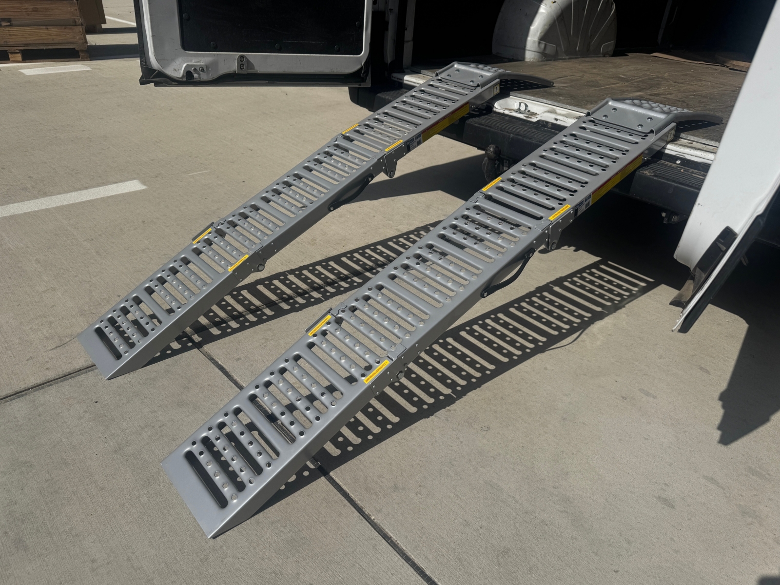 Súprava nájazdové rampy obsahuje 2 ks oceľových skladacích rámp pre motocykle a automobily so šírkou pneumatík do 225 mm.