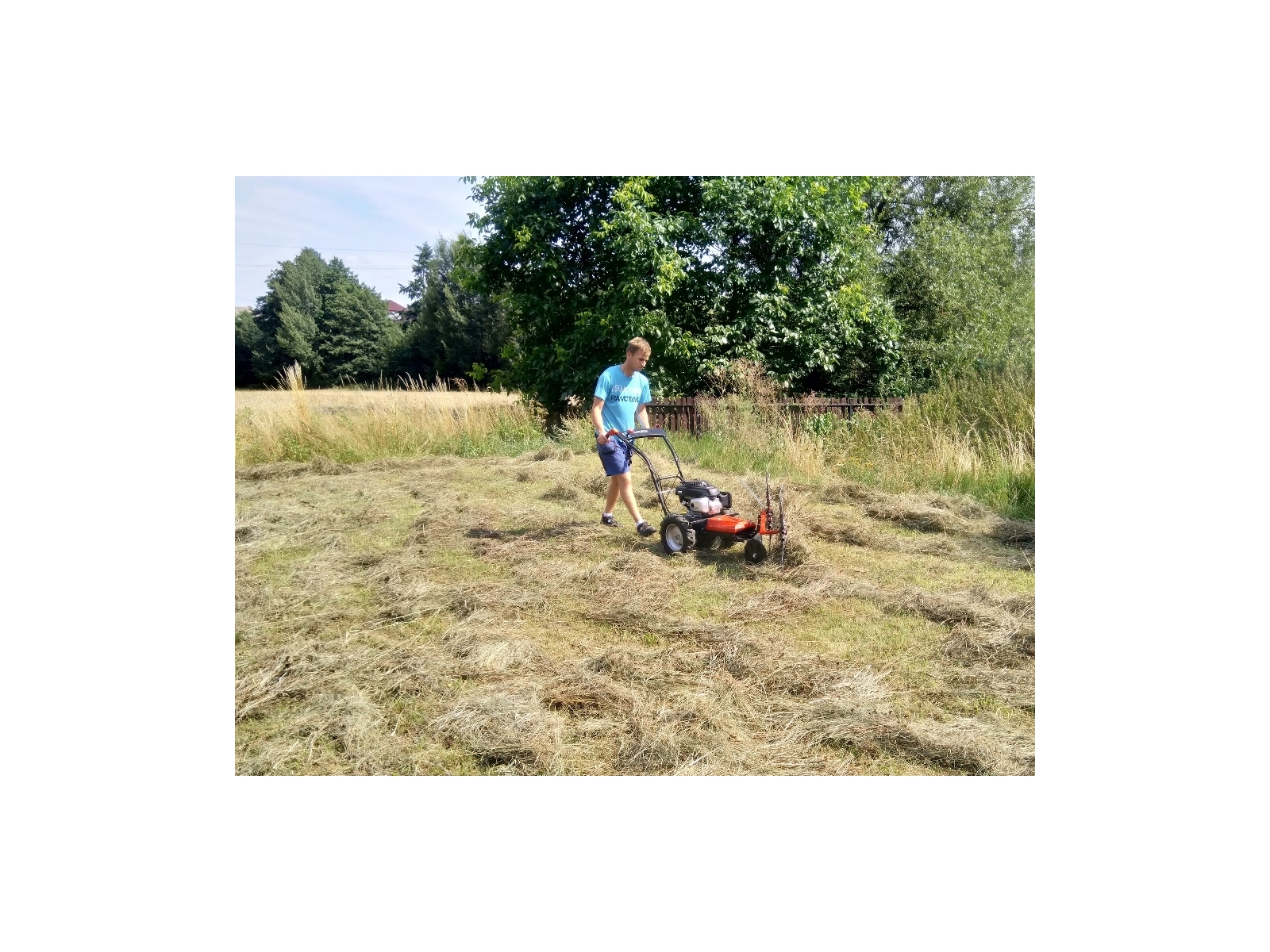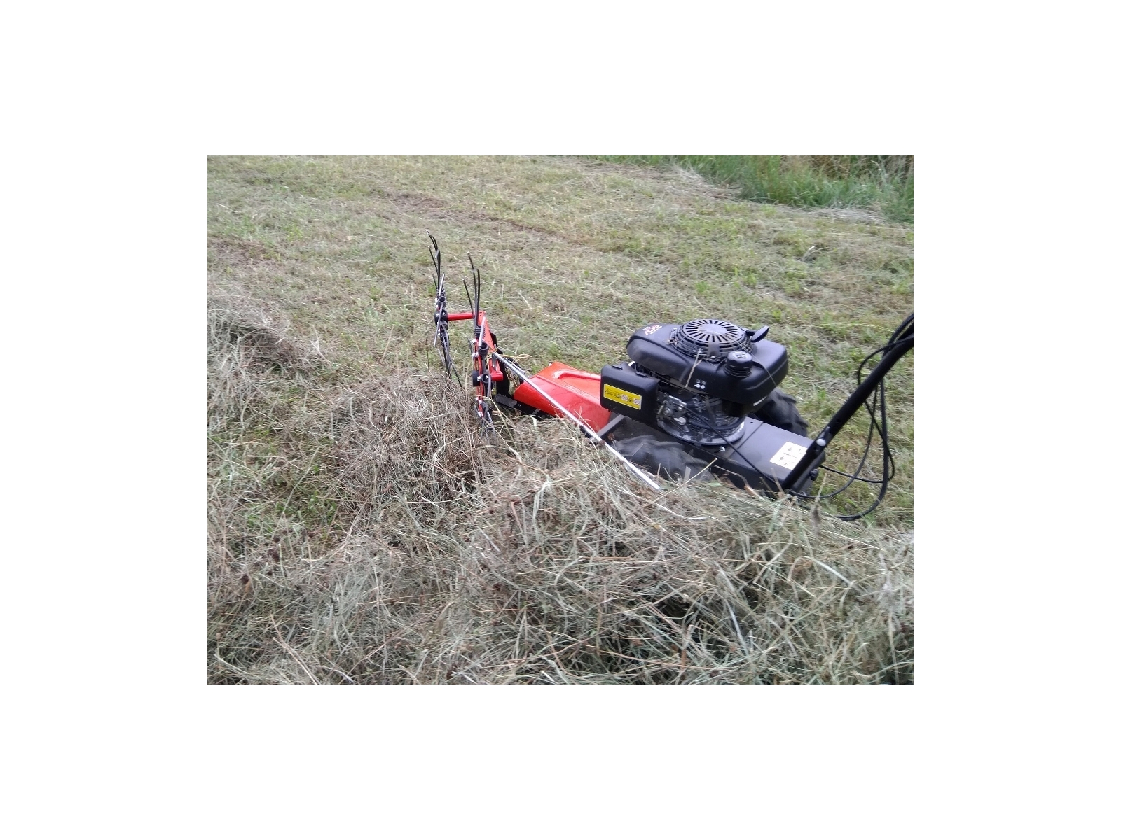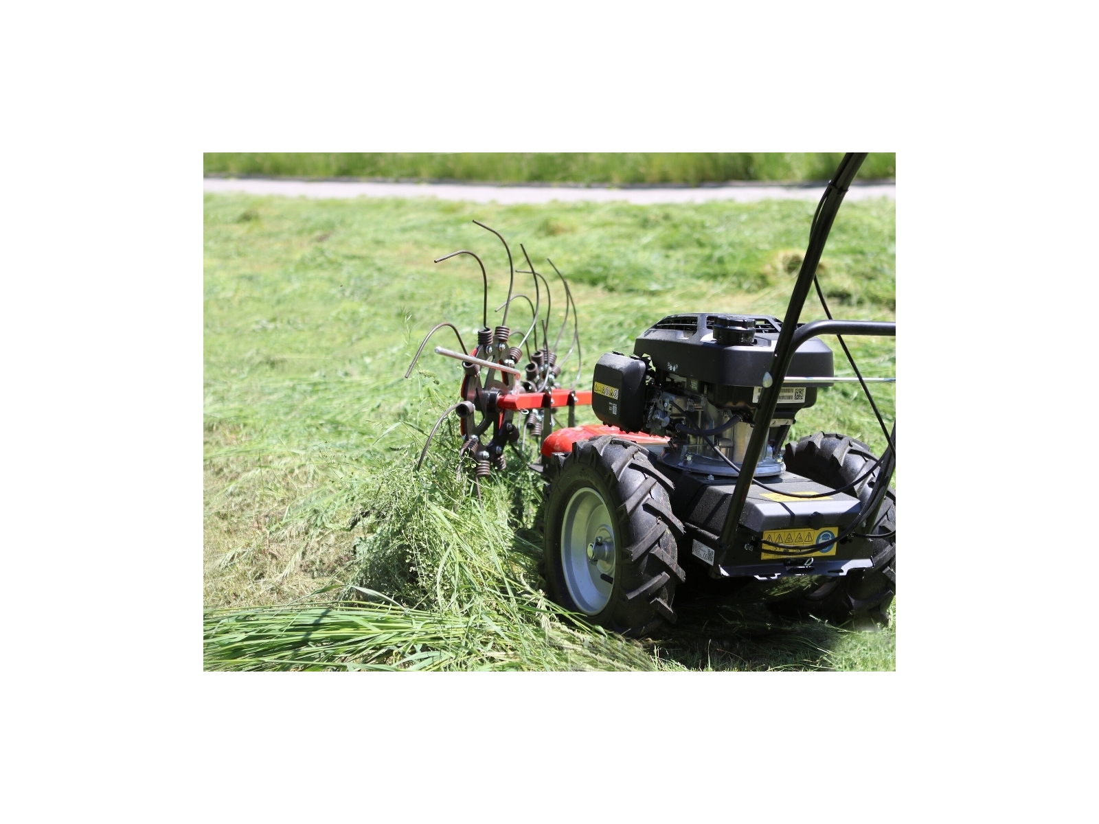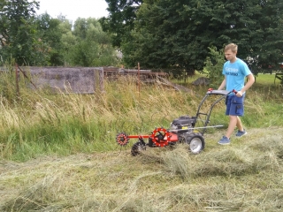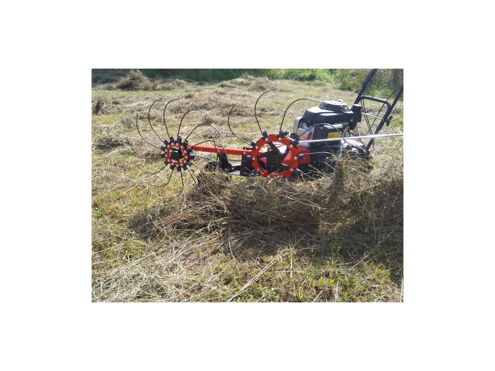 Nedostatočnú pojazdovú rýchlosť multifunkčného nosiča Max, ktorá je k tomuto spôsobu pohonu pre obracanie sena potrebná, sme dohnali dômyselným tvarom ako vlastných pružinových prútov, tak vlastným priemerom a naklopením paprskových kolies.