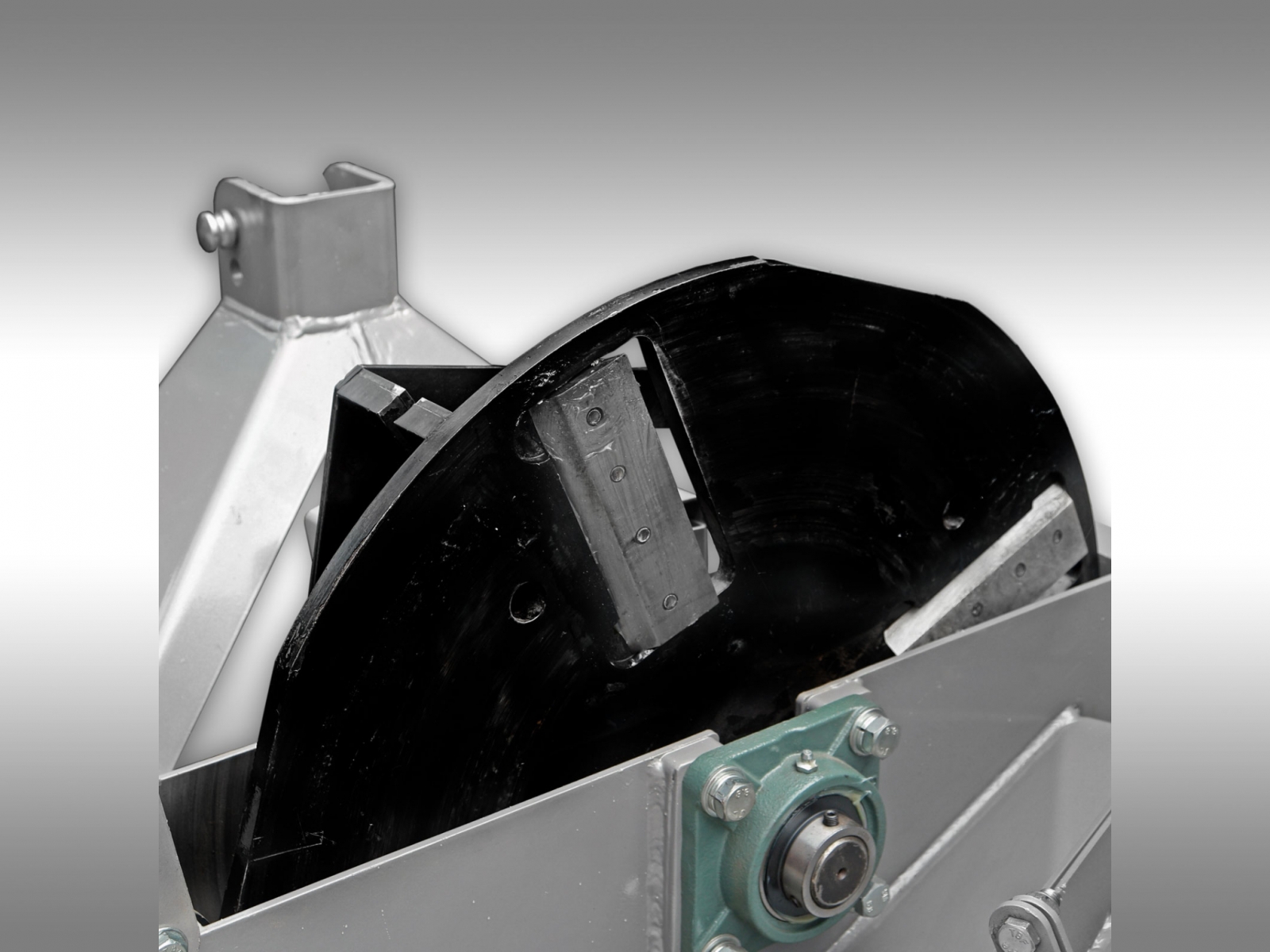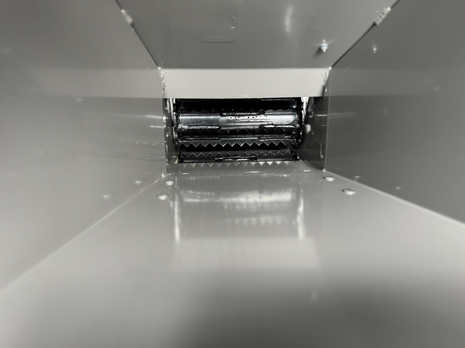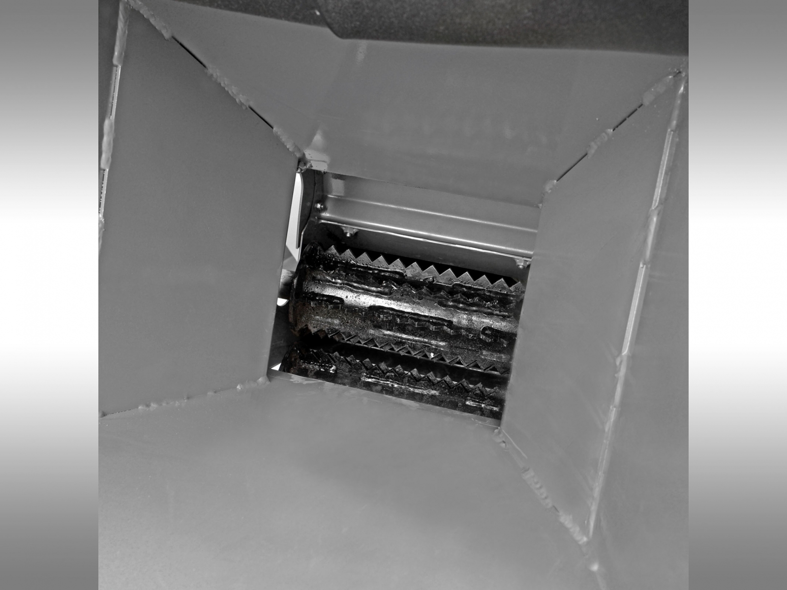 Hrúbka materiálu zaisťuje odolnosť. Stroj je navrhnutý tak, aby sa ľahko udržiaval a po uvoľnení jedinej skrutky je možné otvoriť kryt, aby ste získali prístup k nožom. Tieto rezné nože sú brúsené na oboch stranách, takže ich možno v prípade potreby otáčať.