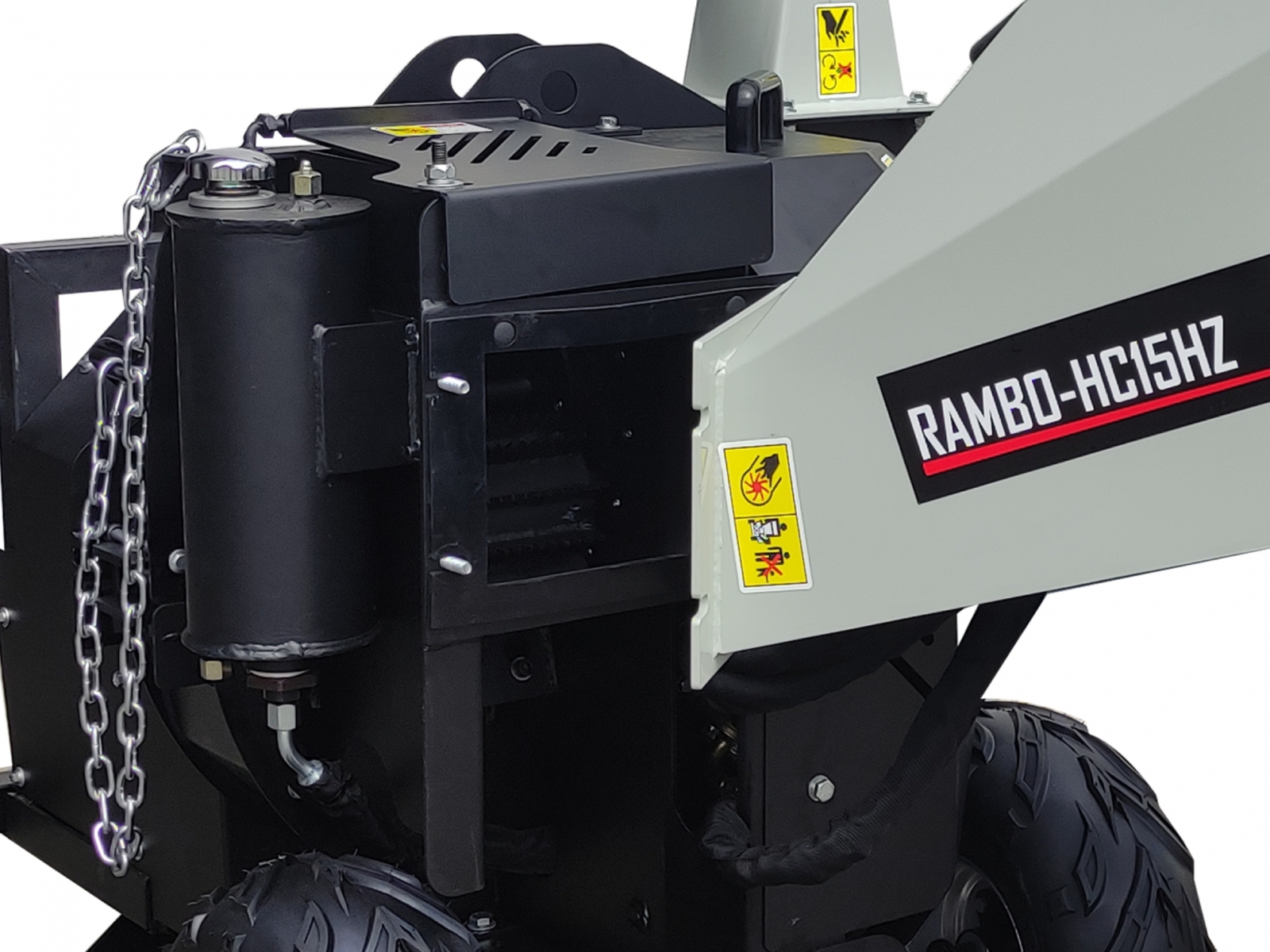 ✓ RAMBO-HC15HZ poháňaný vývodovým hriadeľom traktor bez námahy drví konáre až do priemeru 120 mm.