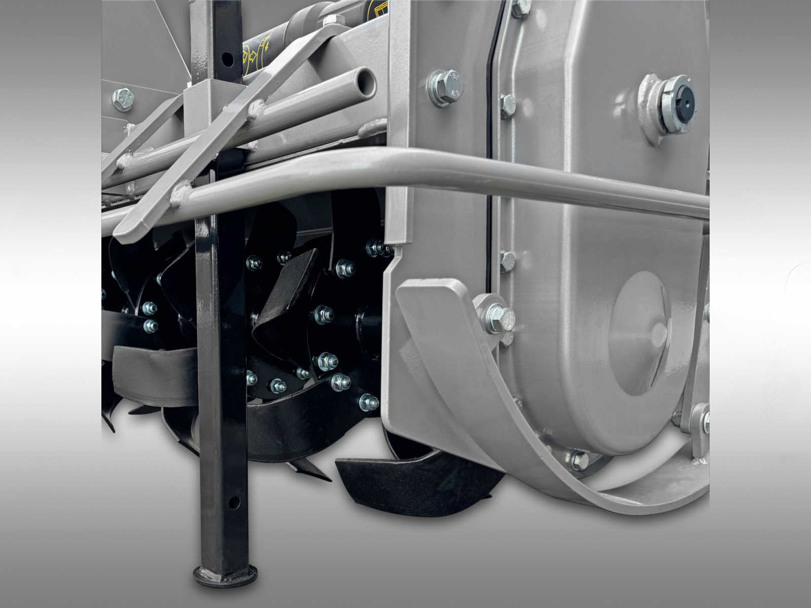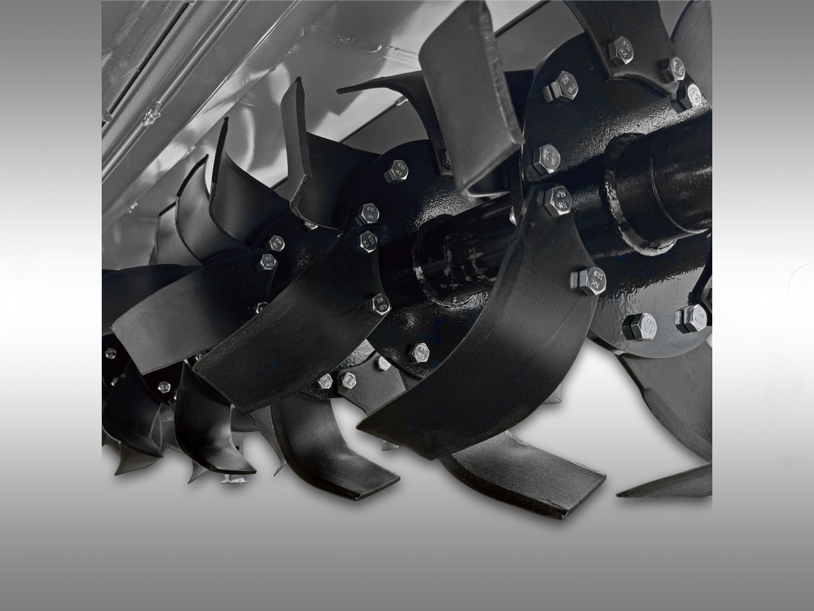 ✓ Zadná ochranná klapka s integrovanou vyrovnávacou pružinou eliminuje nerovnosti a zaisťuje, aby sa zemina primerane rozdrobila.