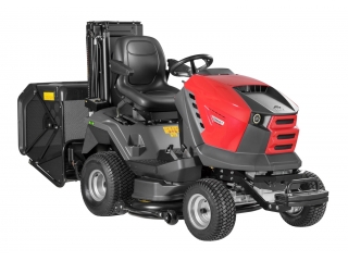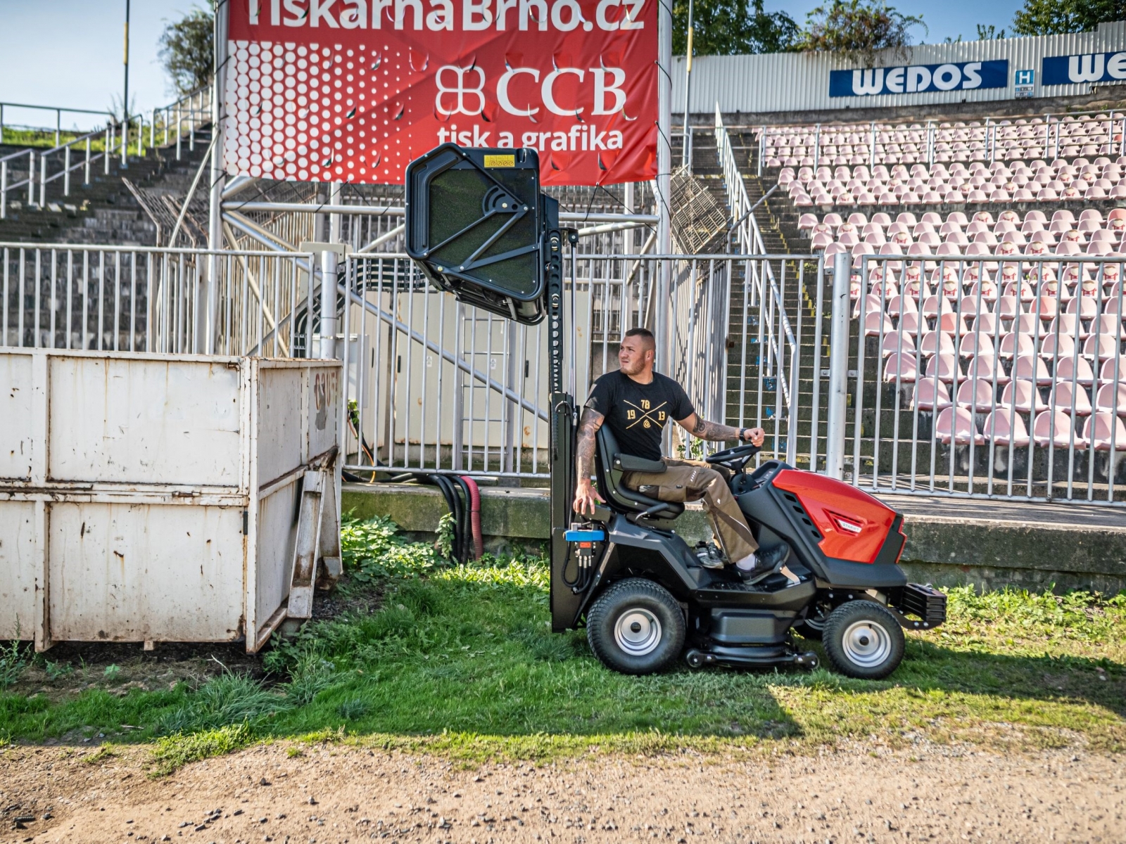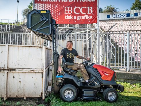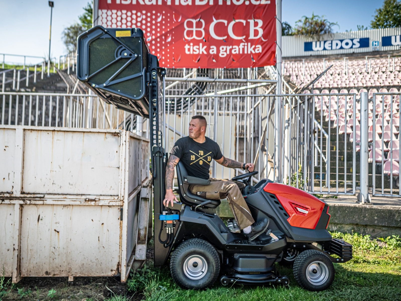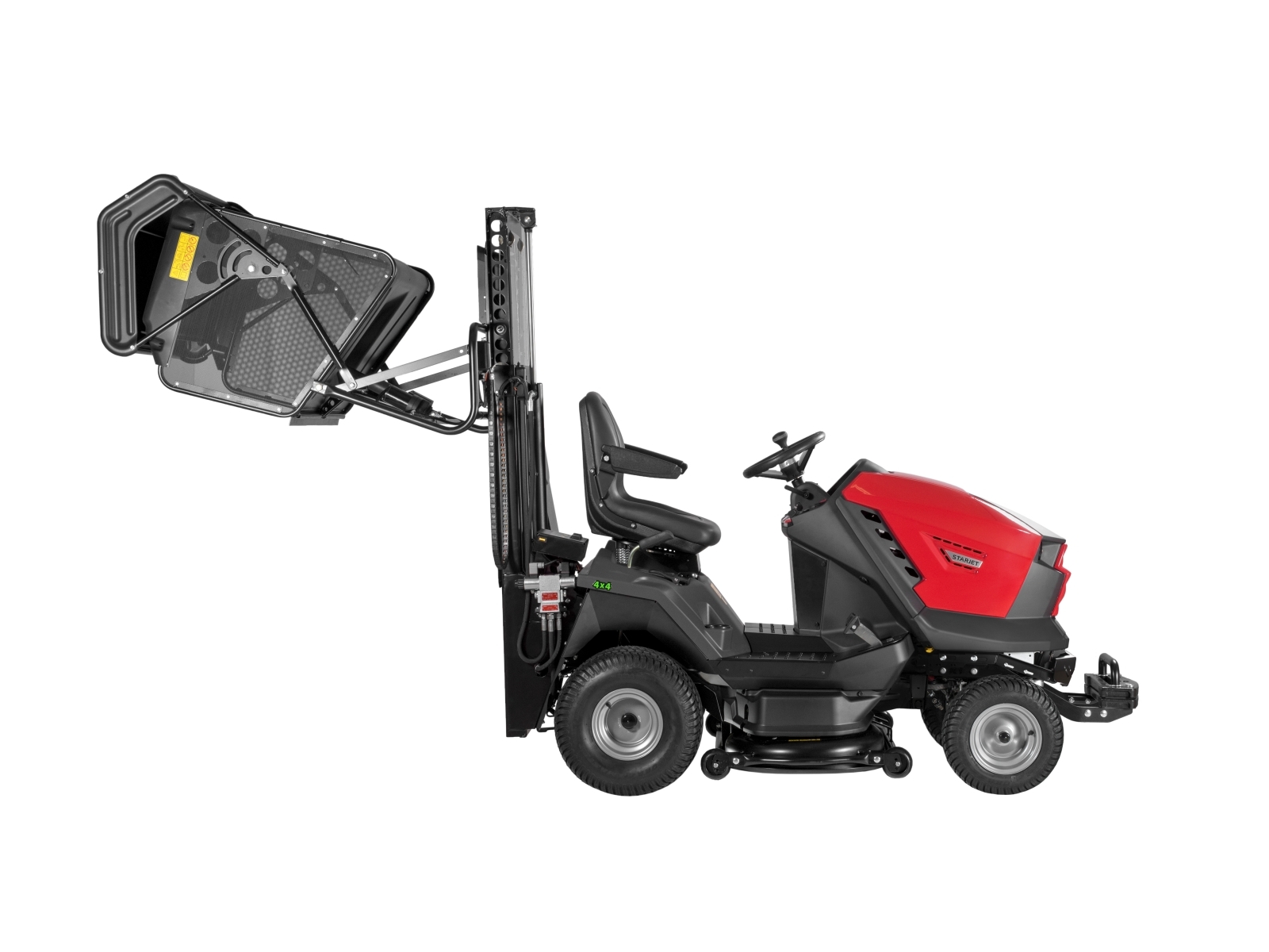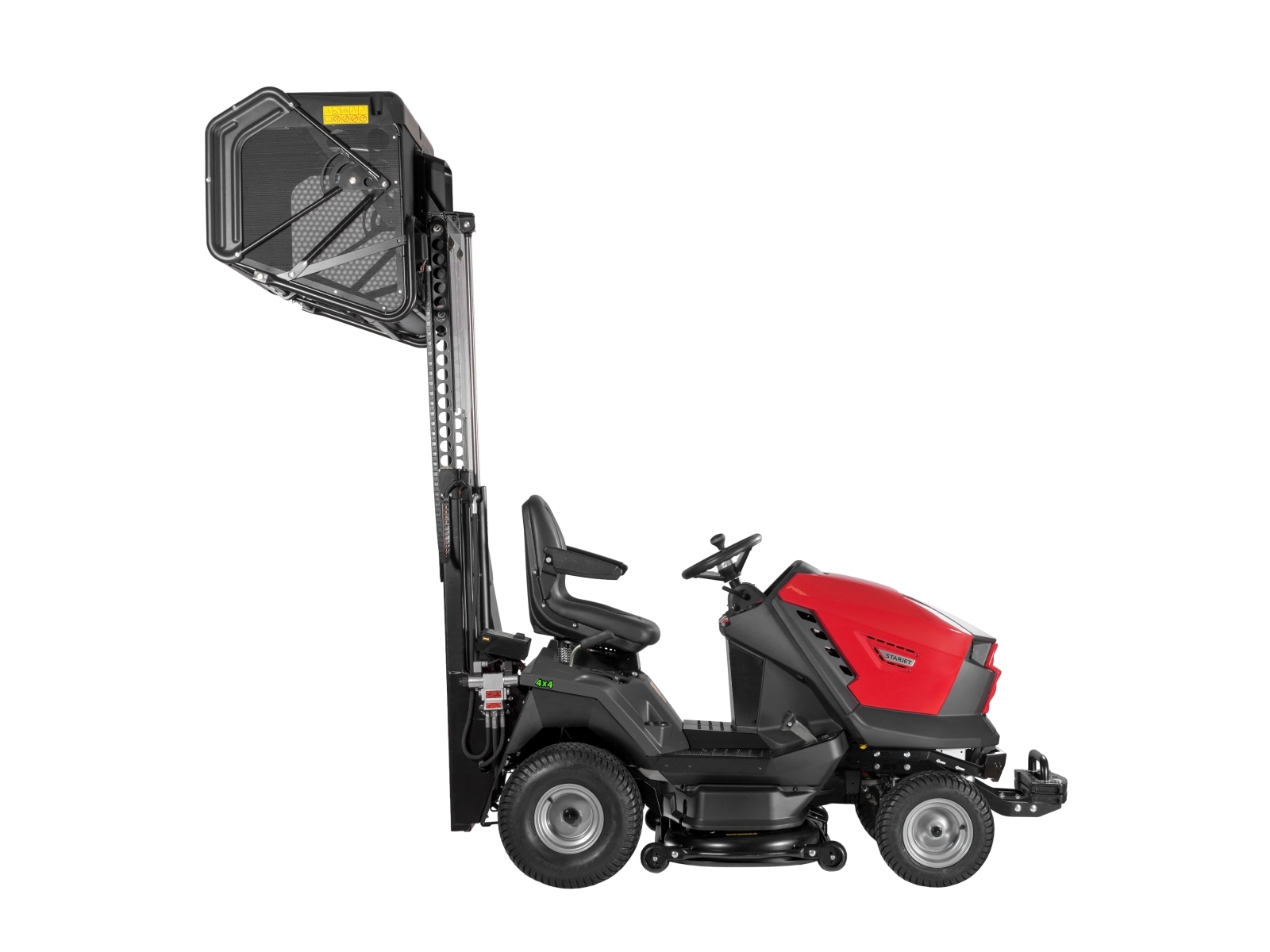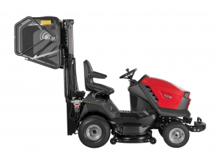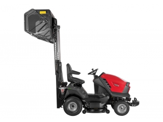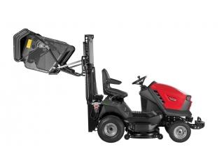Vysokozdvižné vyklápanie zásobníka trávy na zem či do kontajnera.
