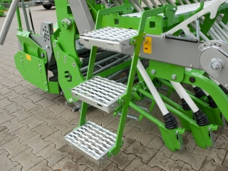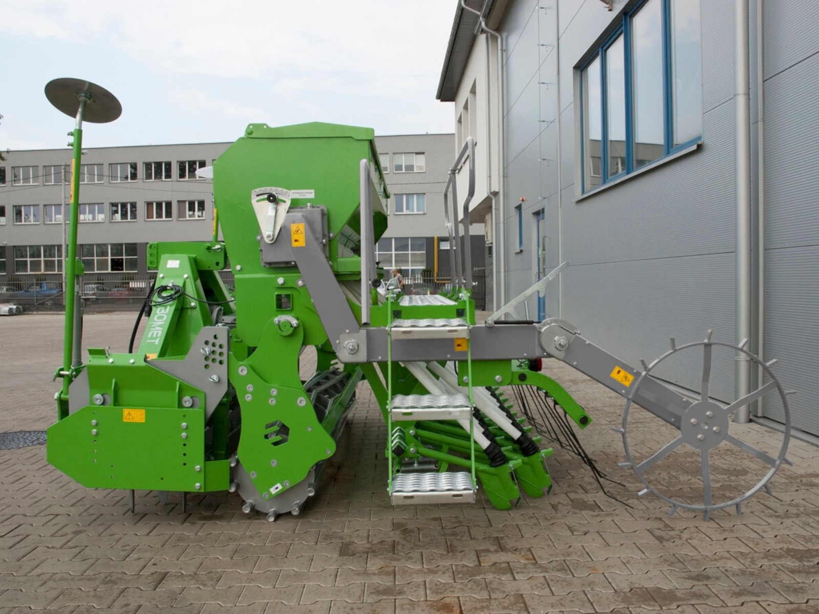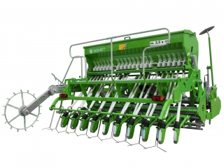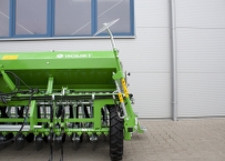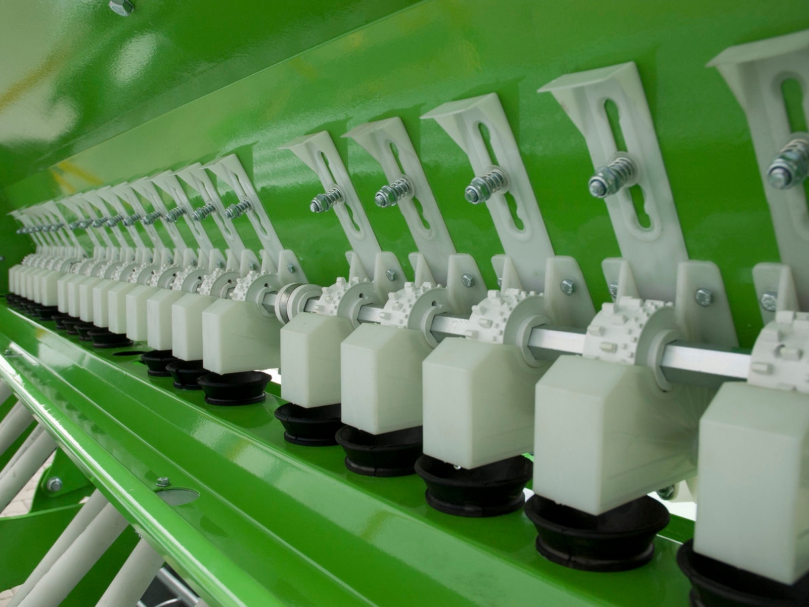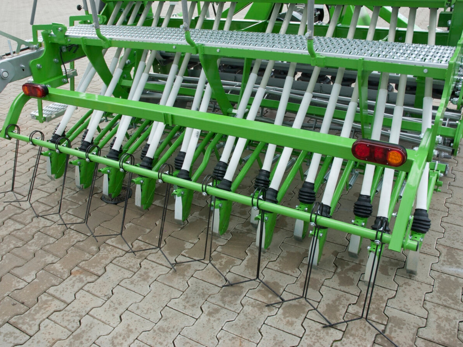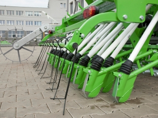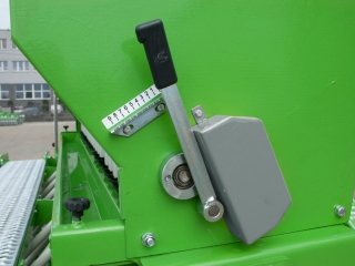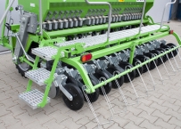 - Zásobník osiva s dnom v tvare "V" zabezpečuje úplné vyprázdnenie osiva. Pohon výsevných jednotiek je cez hnacie kolesá a sústavu reťazových prevodov a 60-polohový bezstupňový prevod.