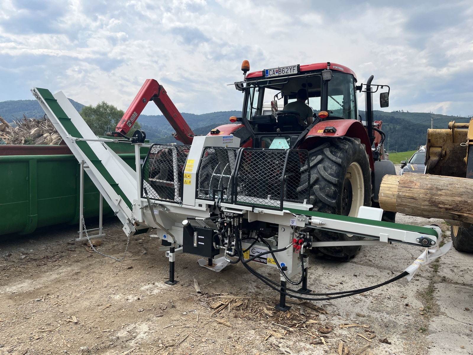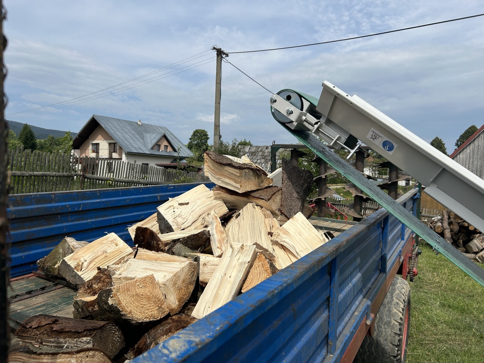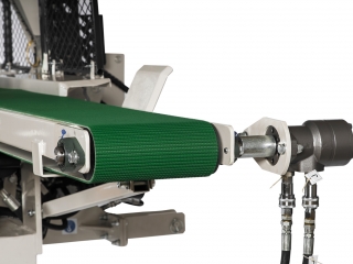 Integrovaný, hydraulický pásový dopravník slúžiaci pre posúvanie guľatiny.