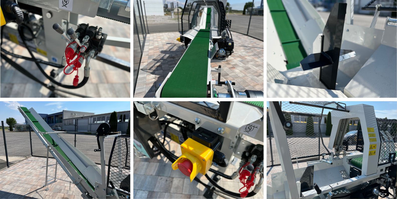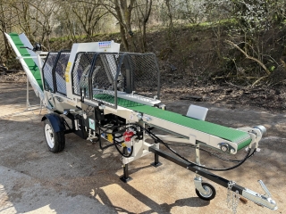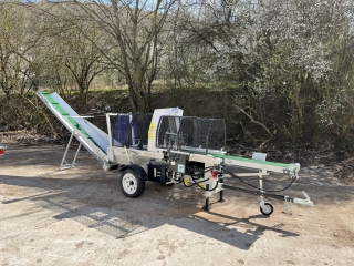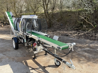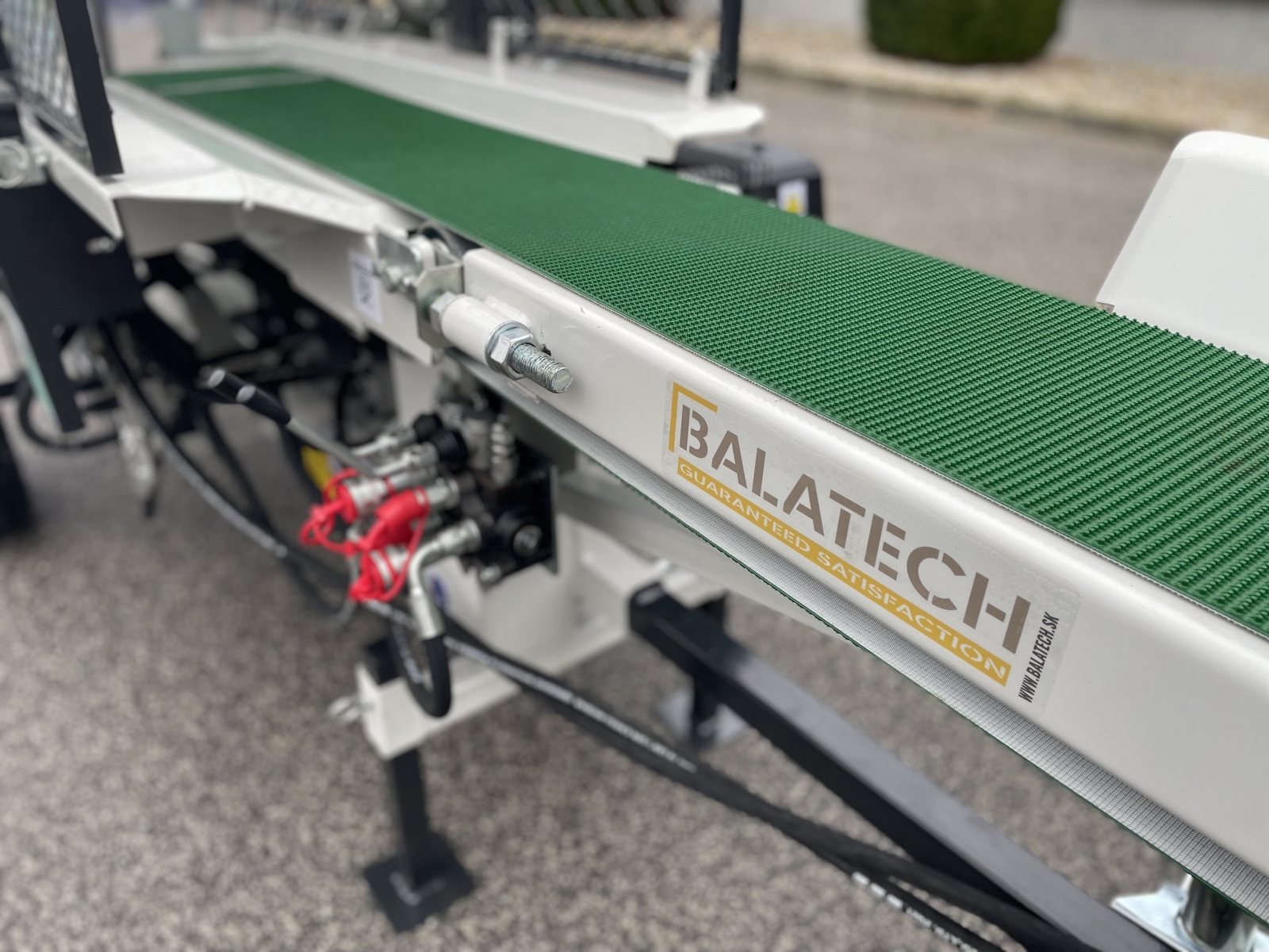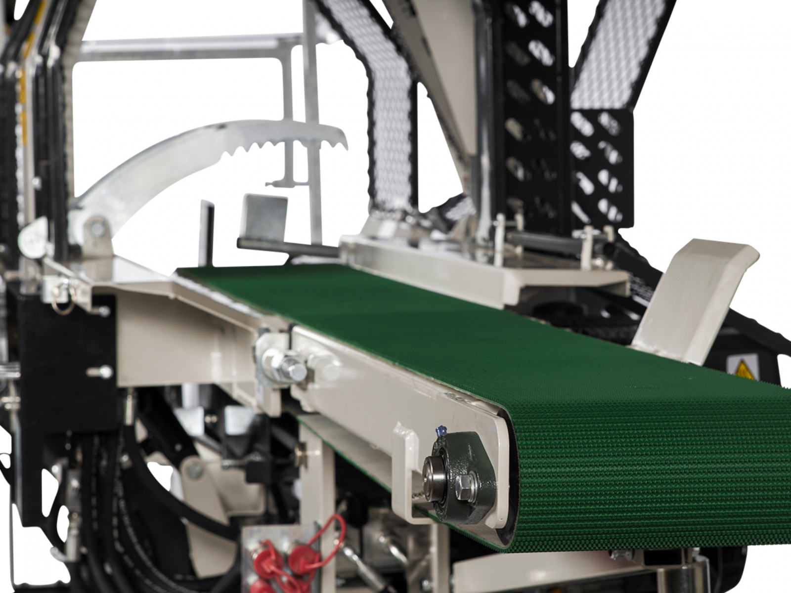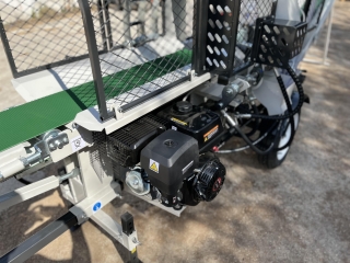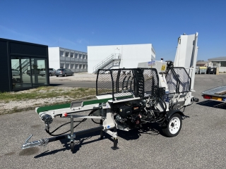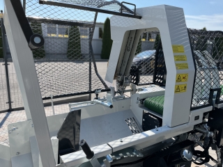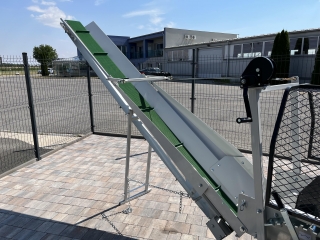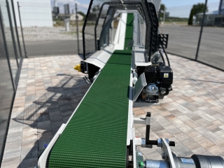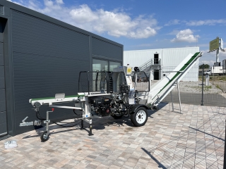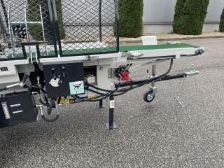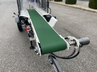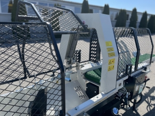 Integrovaný, hydraulický pásový dopravník slúžiaci pre posúvanie guľatiny.
