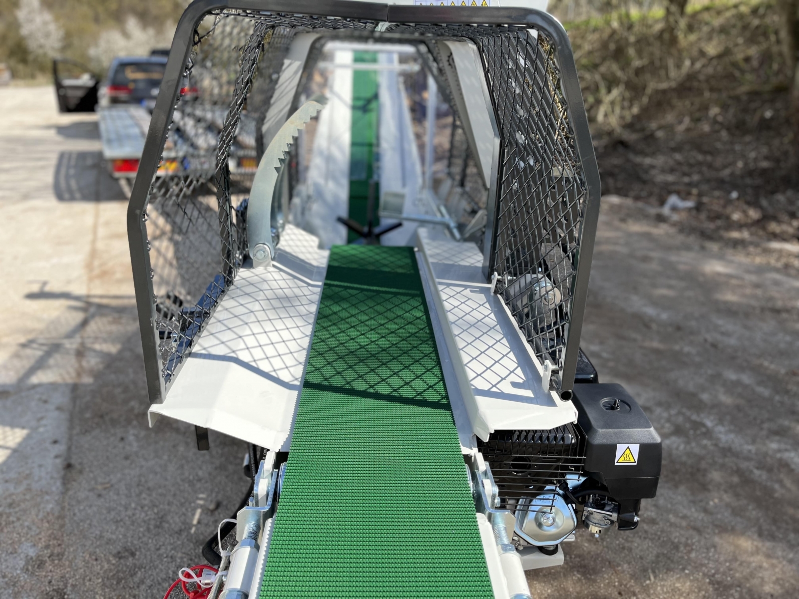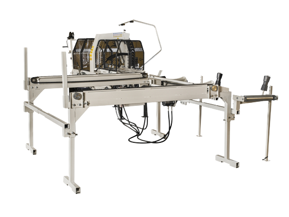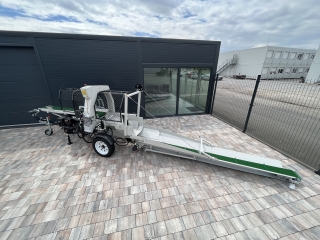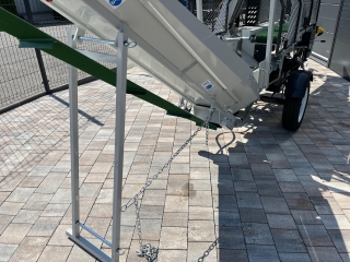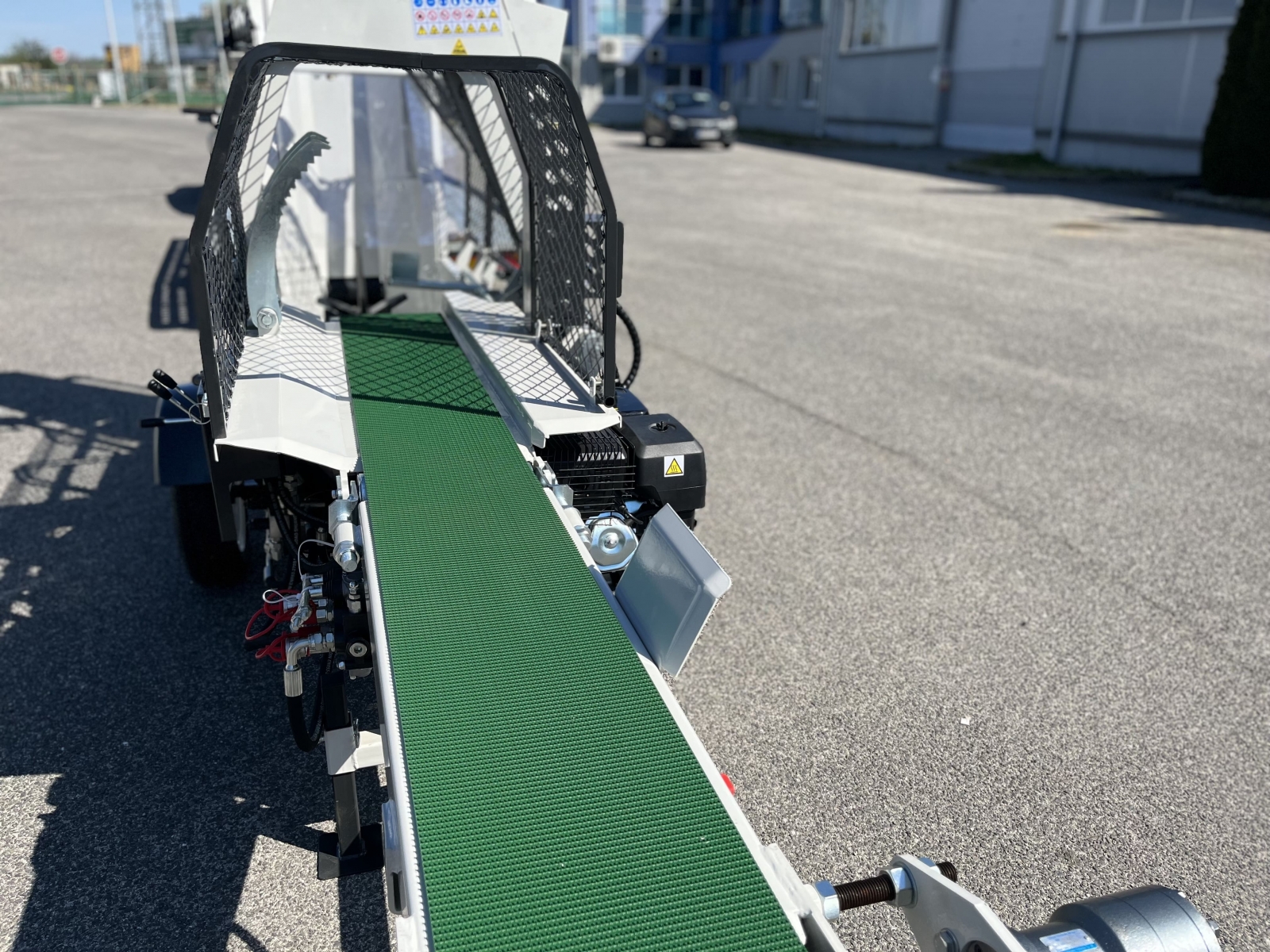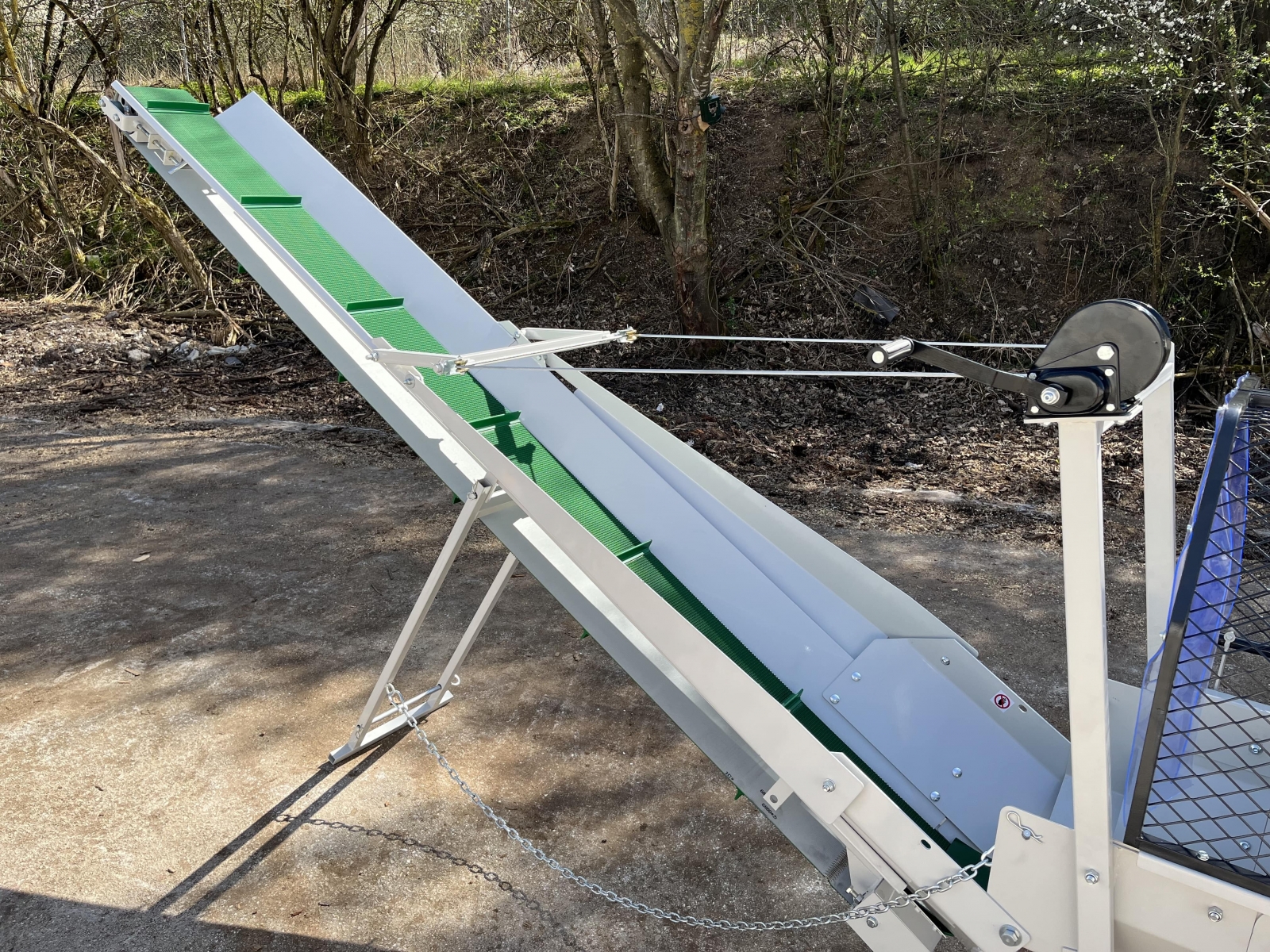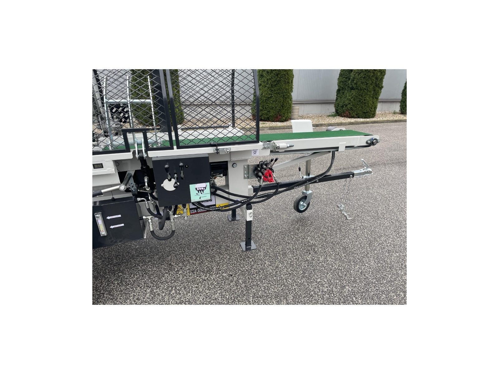Integrovaný, hydraulický pásový dopravník slúžiaci pre posúvanie guľatiny.