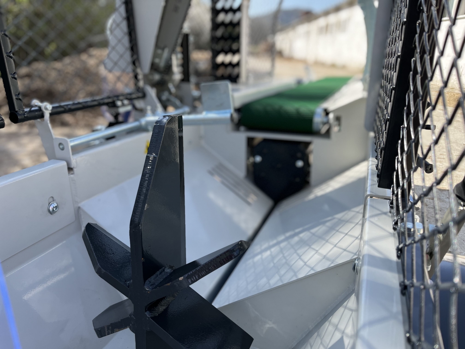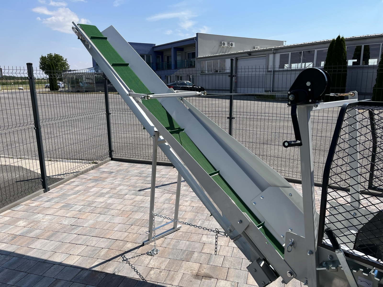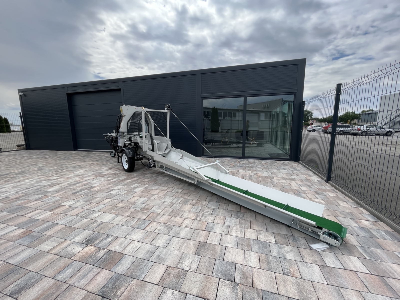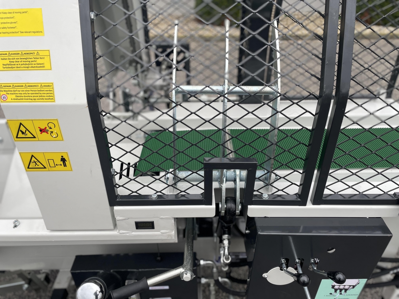 Integrovaný, hydraulický pásový dopravník slúžiaci pre posúvanie guľatiny.