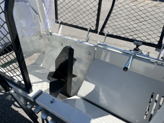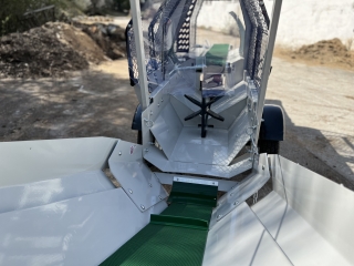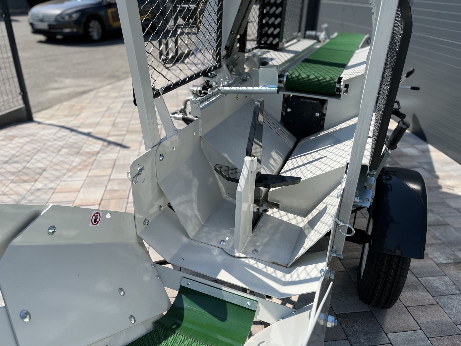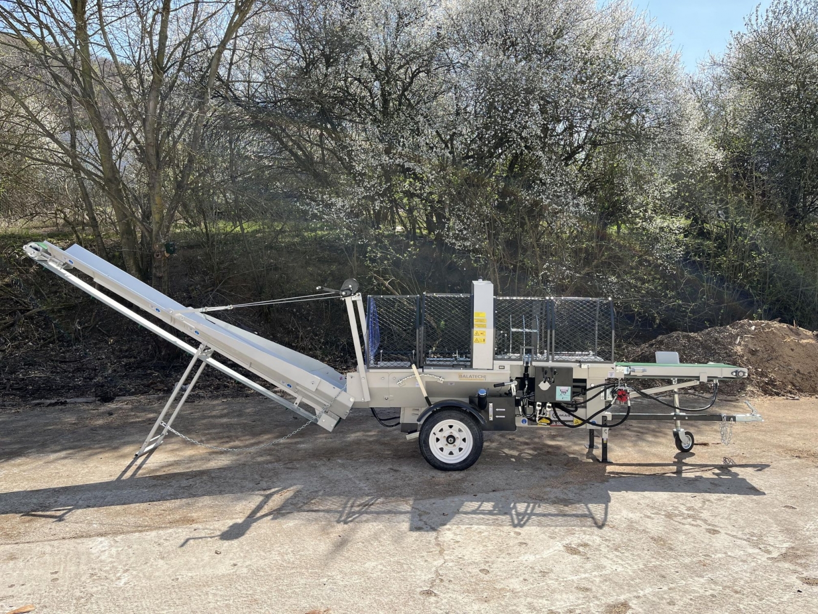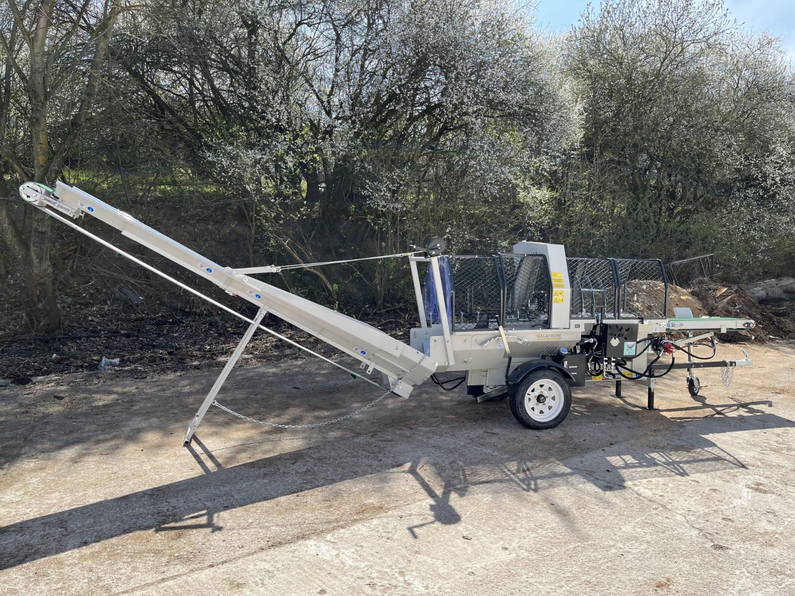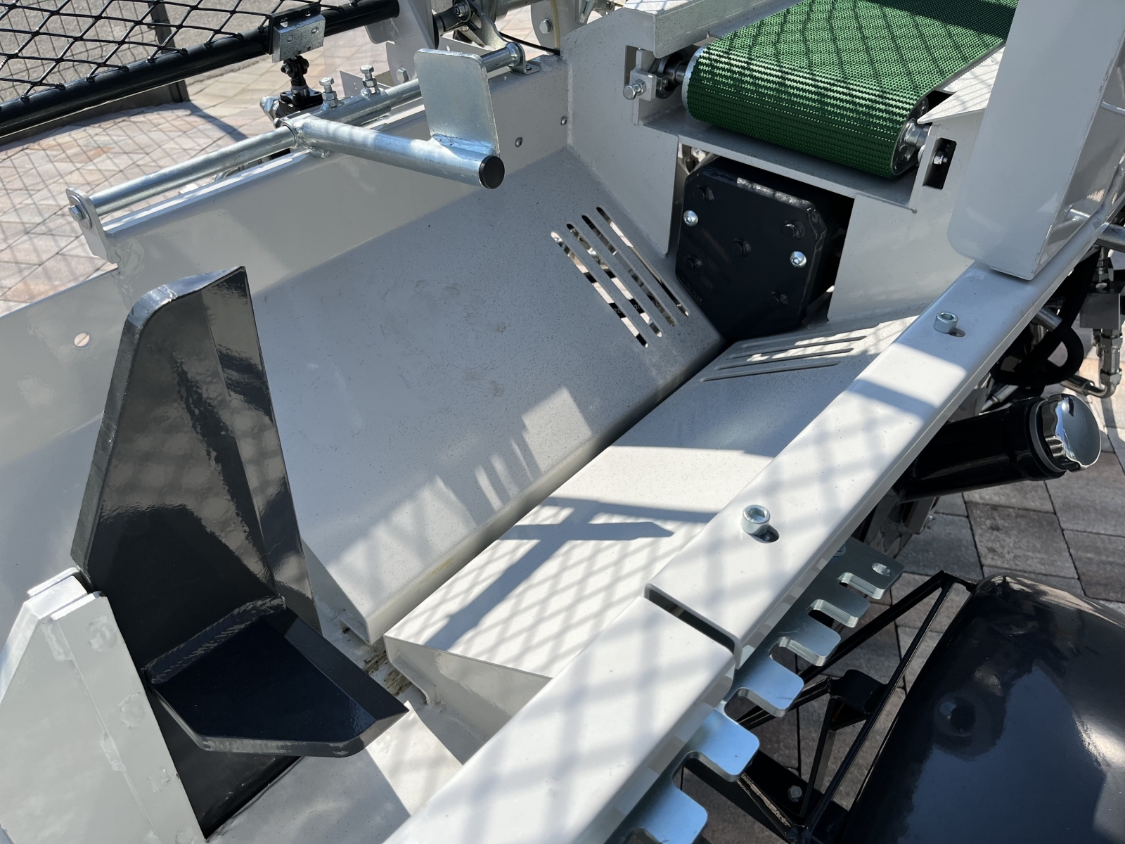 Integrovaný, hydraulický pásový dopravník slúžiaci pre posúvanie guľatiny.