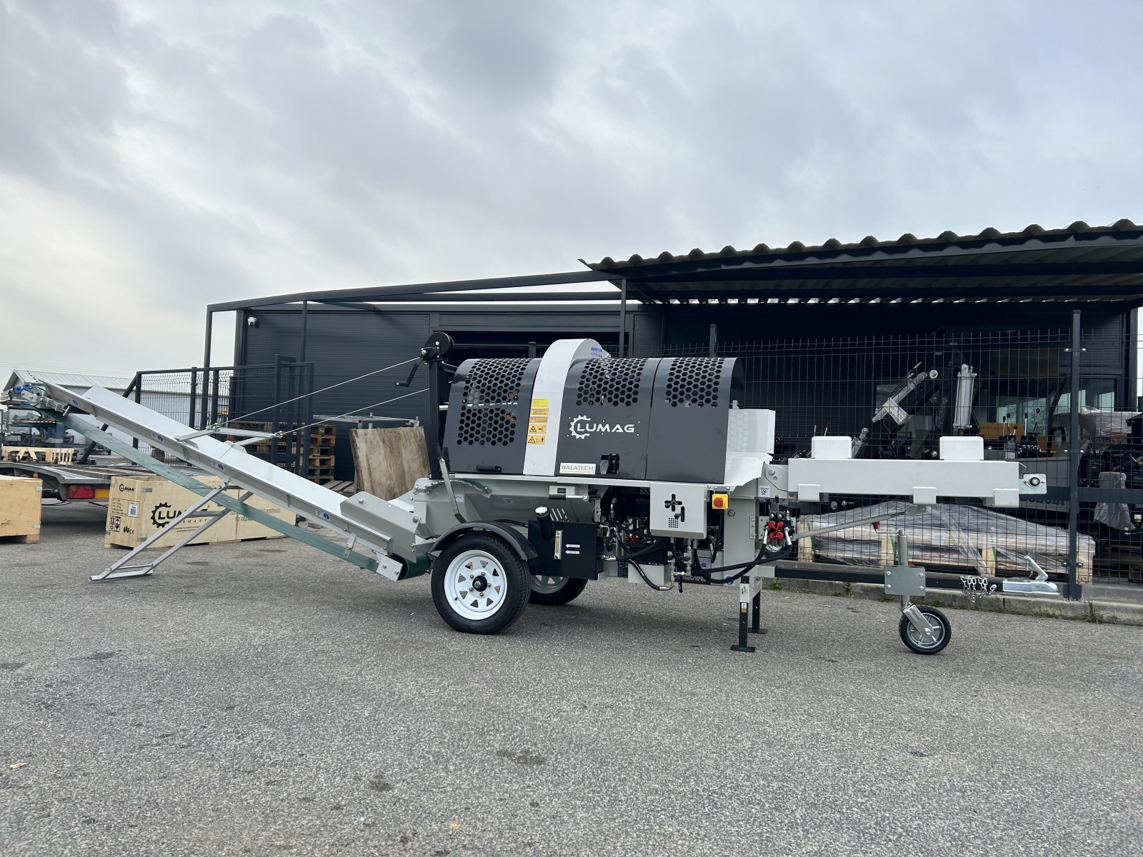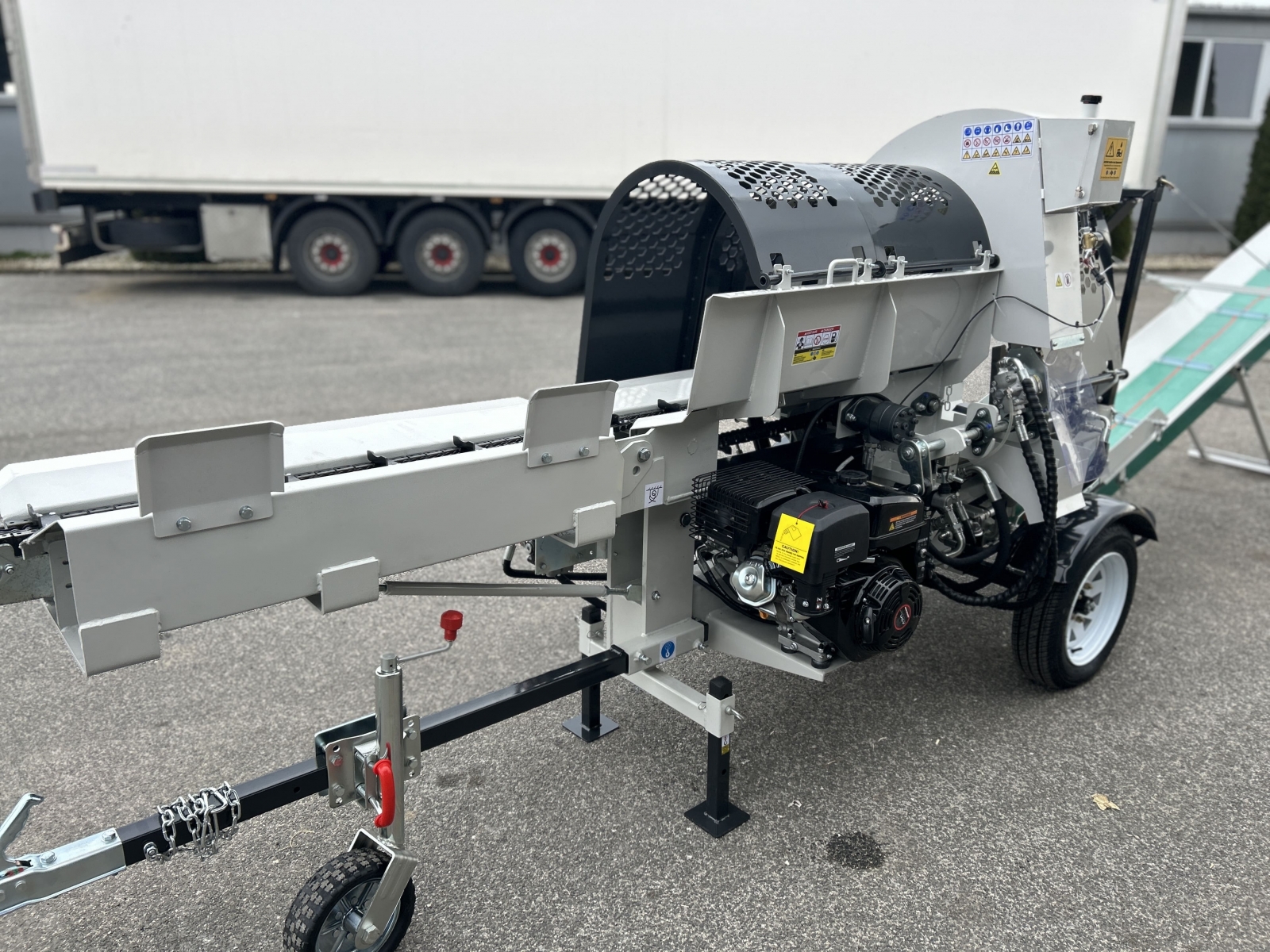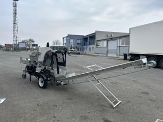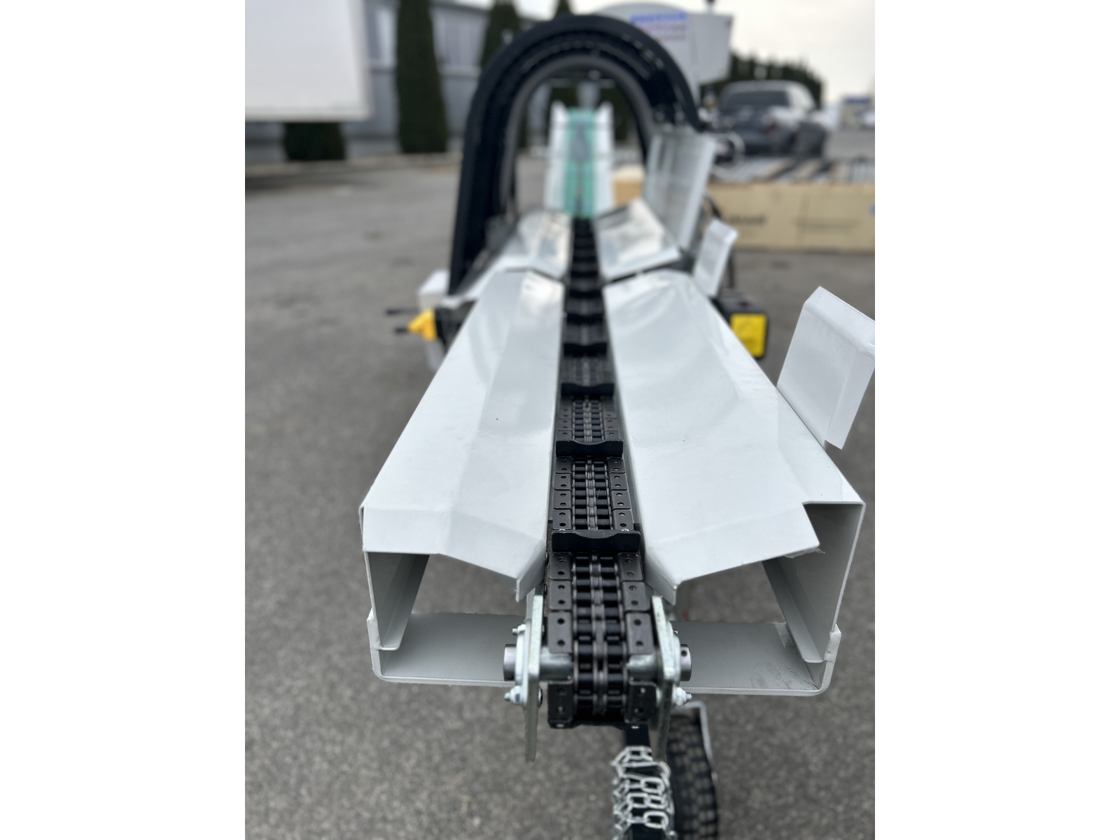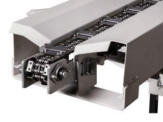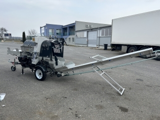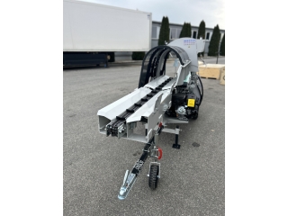 Integrovaný, hydraulický pásový dopravník slúžiaci pre posúvanie guľatiny.