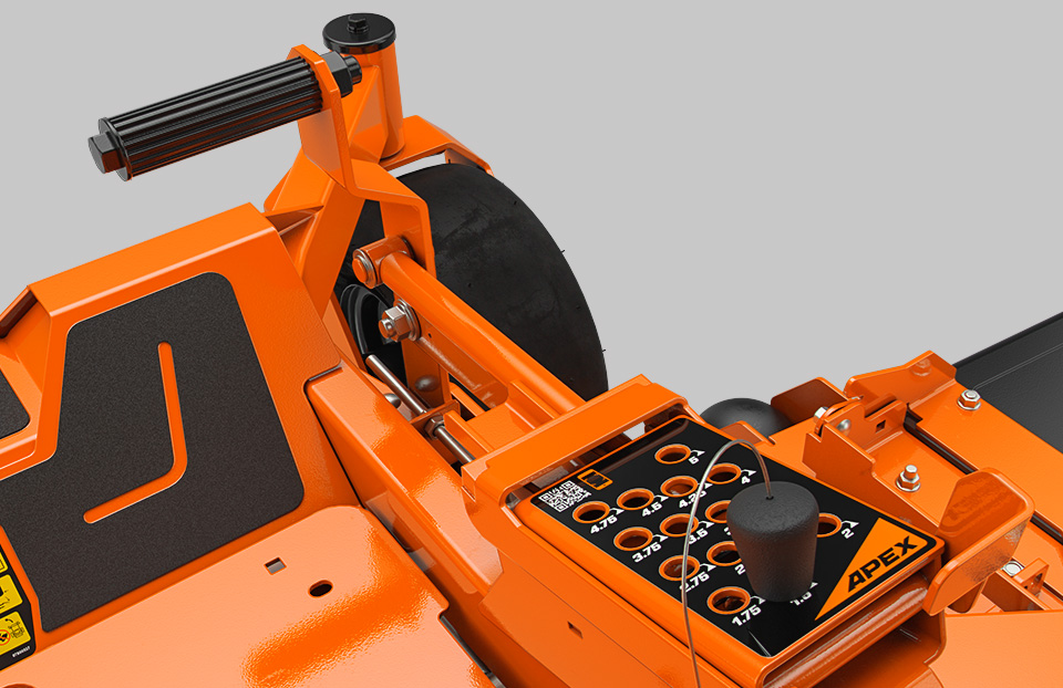 Nožný systém zdvíhania plošiny a jednoduchý výber magnetickým kolíkom umožňujú jednoduché nastavenie medzi 15 polohami kosenia.