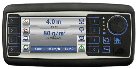 Ovládací panel umožňuje prispôsobiť posyp podľa vašej aktuálnej situácie. Automatická regulácia rýchlosti GPS upravuje množstvo rozmetávaného materiálu (g / m2) podľa rýchlosti vášho vozidla, zatiaľ čo manuálny režim umožňuje zadať konštantnú rýchlosť závitovky. Ovládač dodatočne zhromažďuje a ukladá základné údaje do pamäte USB, čo vám umožňuje generovať správy o posype. Ovládač tiež uľahčuje zapínanie funkcií, ako sú vibrácie, majáky a pracovné svetlo, z vnútra kabíny.